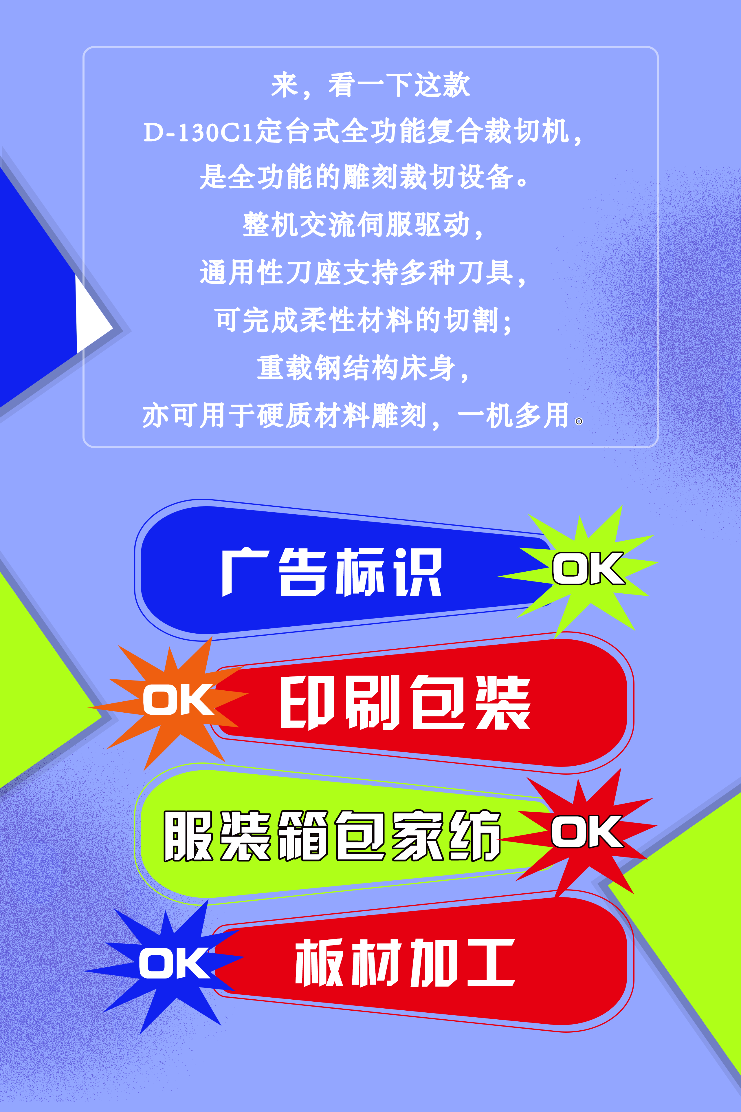 本文《多種材料的加工,一臺(tái)機(jī)器解決》由木工雕刻機(jī)- 光纖激光切割機(jī)-震動(dòng)刀裁切機(jī)賽迪克提供,賽迪克自動(dòng)化設(shè)備有限公司多年專(zhuān)注研發(fā)生產(chǎn)銷(xiāo)售光纖激光切割機(jī)、巡邊雕刻機(jī)、震動(dòng)刀切割機(jī)、木工雕刻機(jī)、賽迪克雕刻機(jī),高速雕銑與切割一站式解決方案,切割機(jī)廠家批發(fā)價(jià)格。