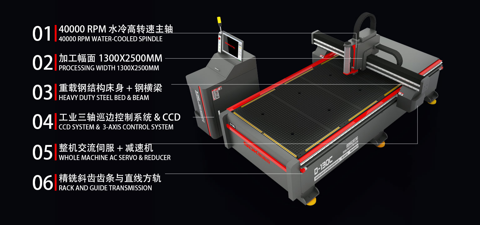 D-130C是SDKCNC自主研發(fā)生產(chǎn)的一款高速巡邊雕刻機,具備對各種硬質(zhì)板材的高速雕銑切割能力,相比我們的傳統(tǒng)機型,它整機采用交流伺服驅(qū)動并配備精密型行星齒輪減速機。動力強勁,高速高精度,配合重型鋼結(jié)構(gòu)床身和龍門銑加工的剛橫梁,確保設(shè)備高速運轉(zhuǎn)過程中不變形。標配的40000RPM高轉(zhuǎn)速主軸以及CCD系統(tǒng),尤其適合各種小型復雜樣片和異性邊緣的高速加工。