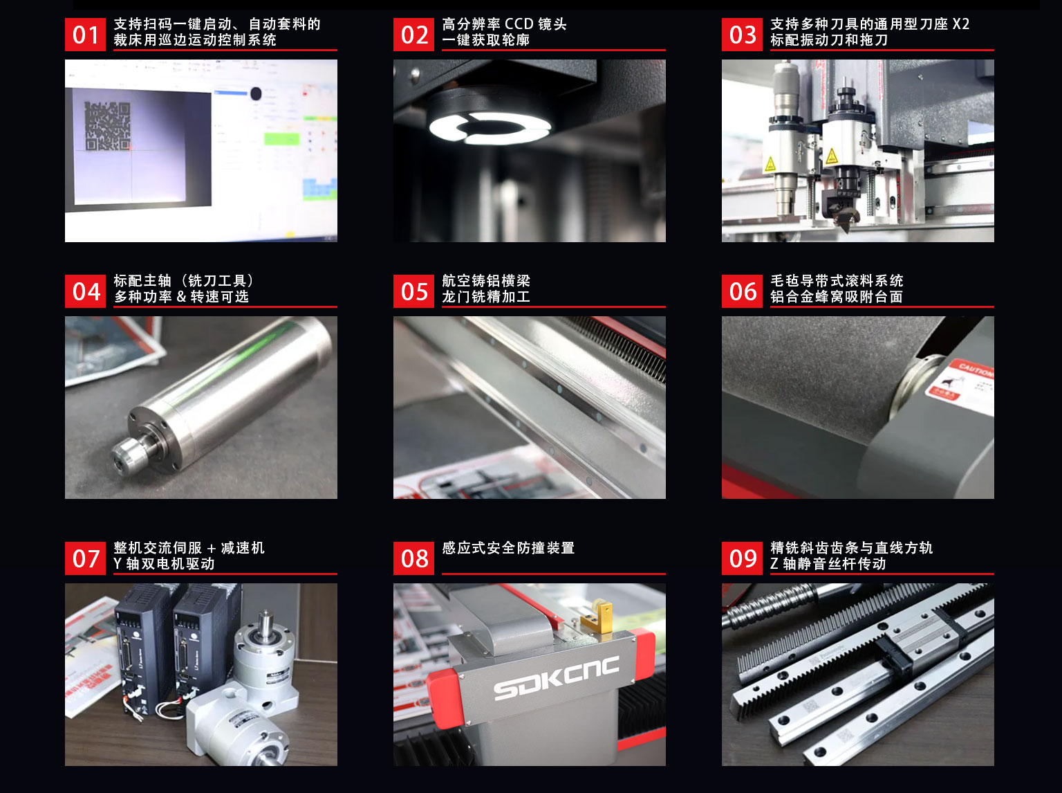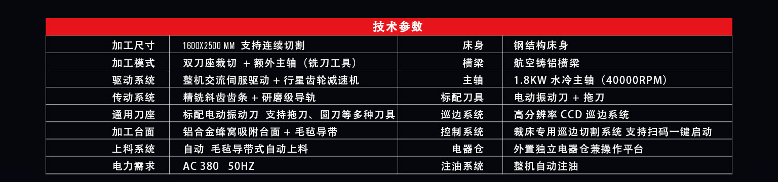 D-160C3是一款對(duì)應(yīng)柔性卷材的高速異形裁切設(shè)備,采用導(dǎo)帶式加工平臺(tái)適合超長(zhǎng)材料的連續(xù)切割。雙刀座,標(biāo)配電動(dòng)振動(dòng)刀和拖刀,通用型的刀座支持圓刀、寫切刀、壓痕刀等多種刀具。支持掃碼一鍵啟動(dòng)的裁床用巡邊控制系統(tǒng),可高速完成柔性材料的裁切、半切、壓痕,開槽,沖孔,輪廓識(shí)D-160C3是一款對(duì)應(yīng)柔性卷材的高速異形裁切設(shè)備,采用導(dǎo)帶式加工平臺(tái)適合超長(zhǎng)材料的連續(xù)切割。雙刀座,標(biāo)配電動(dòng)振動(dòng)刀和拖刀,通用型的刀座支持圓刀、寫切刀、壓痕刀等多種刀具。支持掃碼一鍵啟動(dòng)的裁床用巡邊控制系統(tǒng),可高速完成柔性材料的裁切、半切、壓痕,開槽,沖孔,輪廓識(shí)別裁切等多項(xiàng)工藝。別裁切等多項(xiàng)工藝。標(biāo)配銑刀工具也可以用于硬質(zhì)板材的雕刻加工